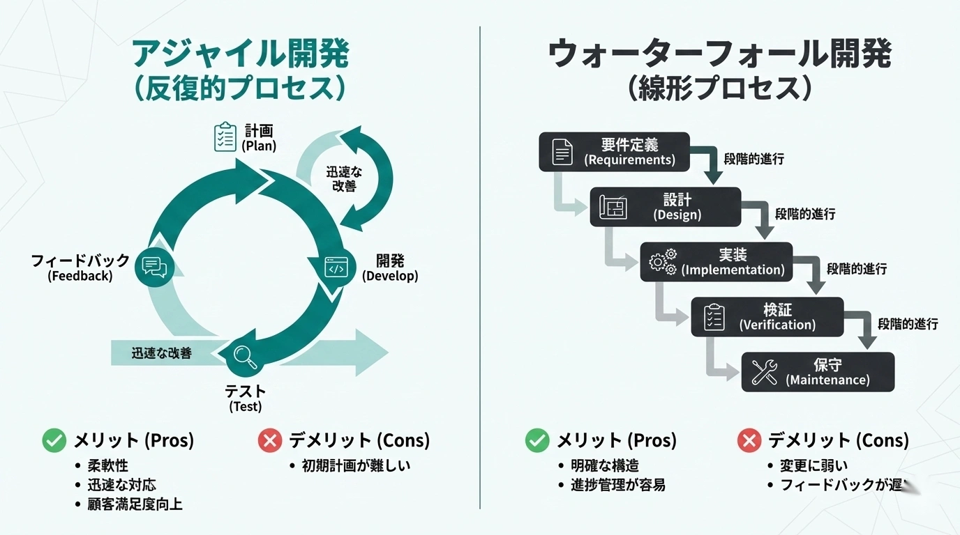 | 向いているケース | 要件が明確、変更が少ない | 要件が不明確、変化が激しい |