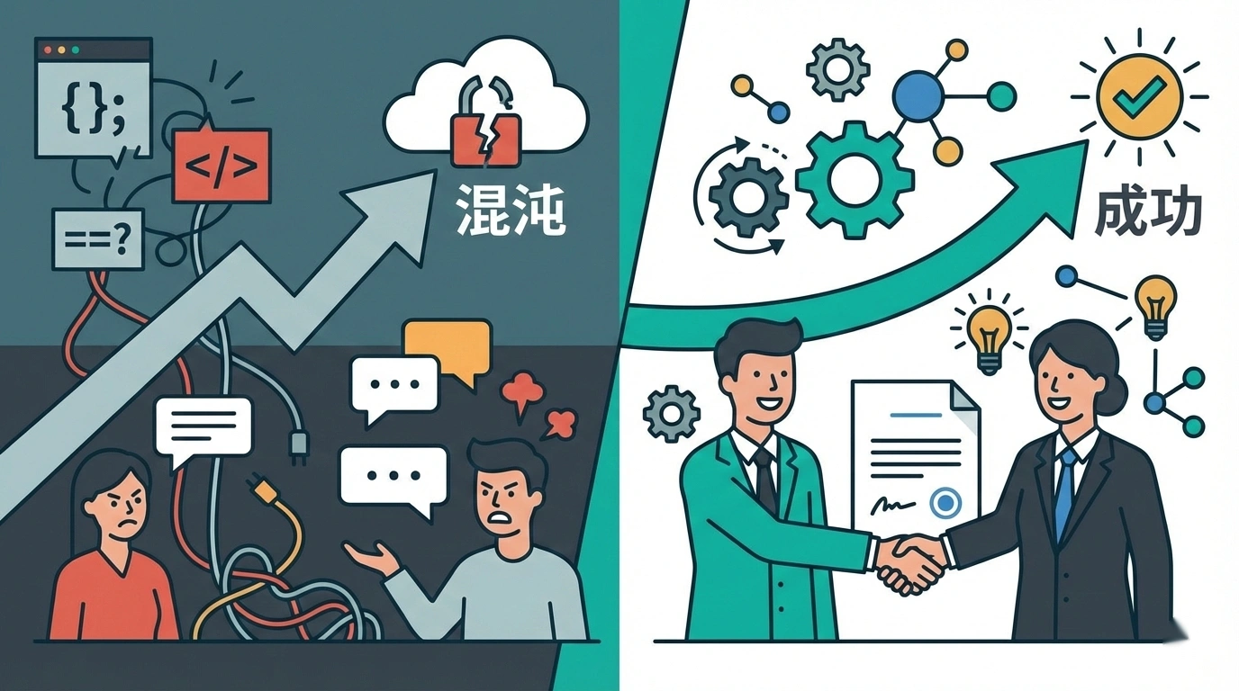 その結果、開発が進むにつれて「思っていたのと違う」が頻発。修正の修正が重なり、時間もコストも際限なく膨らんでいきます。