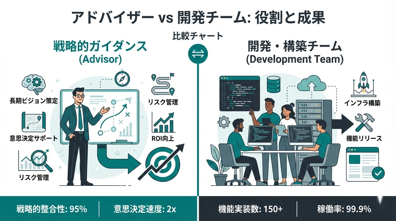 重要なポイント:技術顧問と開発会社は、どちらか一方を選ぶものではないということです。むしろ、両方を適切に組み合わせることで、開発の成功確率は大きく高まります。